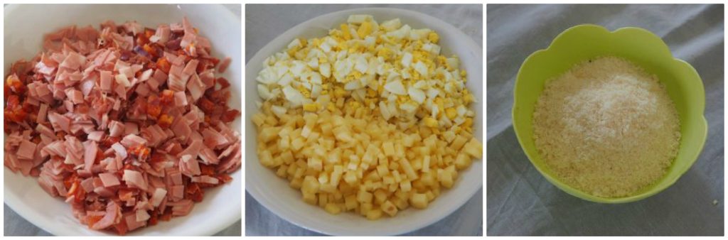 Vous pouvez également utiliser les fromages que vous aimez le plus : pecorino, provolone. Pour cette recette, j’ai utilisé : 50 gr. de parmesan râpé, 150 gr. d’emmental.