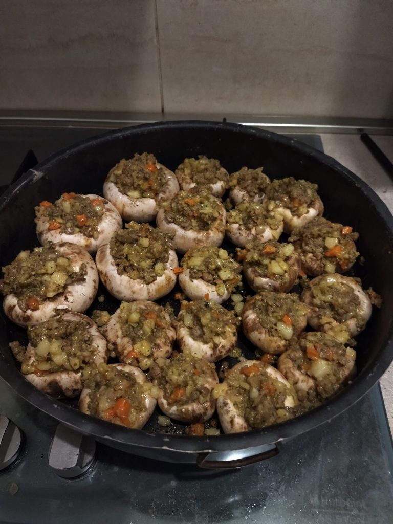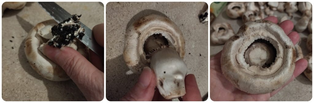 Nettoyez les champignons en éliminant la terre, détachez délicatement les pieds et mettez-les de côté, creusez légèrement l’intérieur du chapeau. Nettoyez les chapeaux avec un chiffon humide.