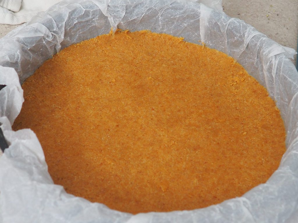 • Recouvrez de papier sulfurisé un moule de diamètre 22 cm ou si vous avez un moule démontable c’est préférable, il sera plus facile d’extraire le gâteau. Versez maintenant la pâte de biscuits et nivelez-la bien. Mettez au réfrigérateur pendant environ une demi-heure.