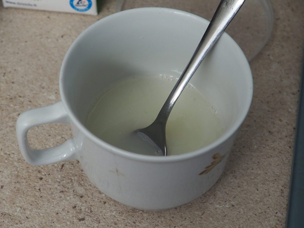 • Une fois que la gélatine est ramollie, mettez deux cuillères à soupe de lait dans un bol, ajoutez les feuilles de gélatine essorées et faites chauffer au micro-ondes pendant quelques secondes.