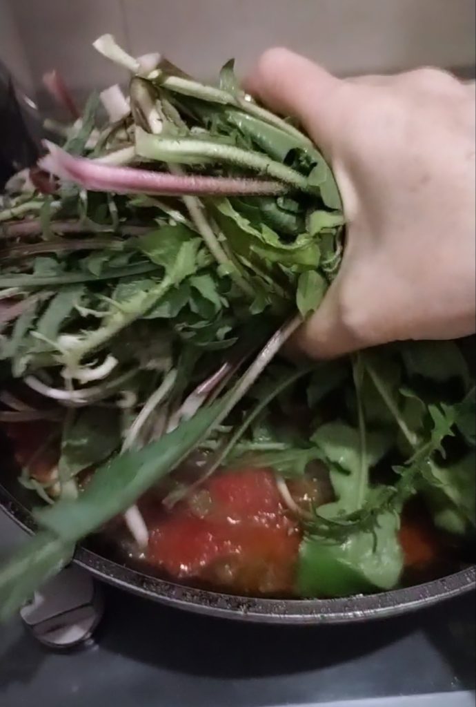 C’est le moment d’ajouter la chicorée, ne vous laissez pas effrayer si cela semble trop, pendant la cuisson elle se ramollira.