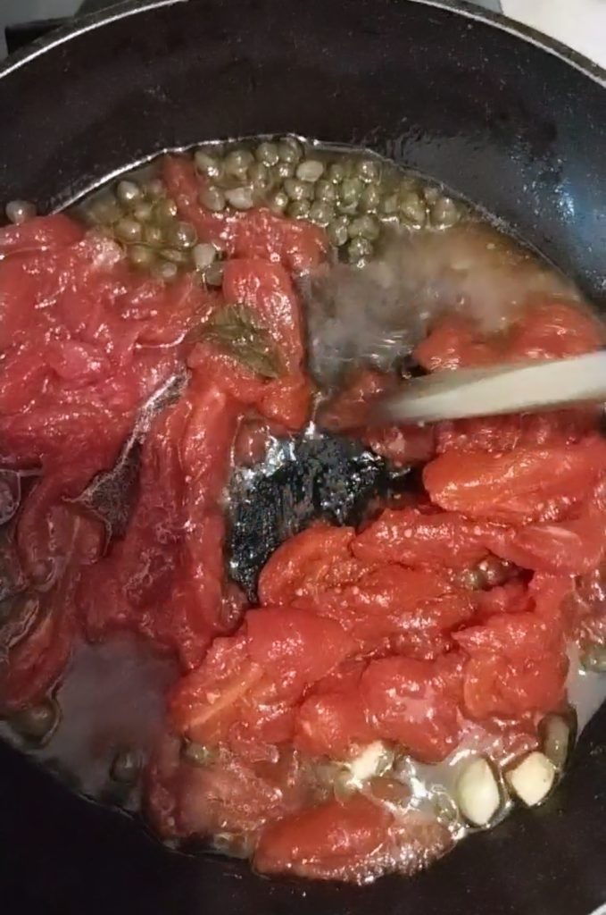 Dans une grande poêle, mettez un peu d’huile, l’ail, le piment en poudre et les câpres. Faites revenir rapidement, puis ajoutez les tomates pelées. Laissez cuire quelques minutes.