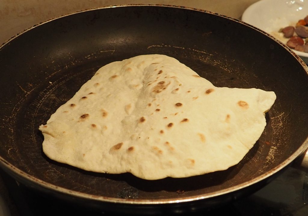 • Faites bien chauffer une poêle, placez la première tortilla à l’intérieur, faites-la cuire à feu vif pendant environ une minute, retournez-la et faites-la cuire encore une minute.