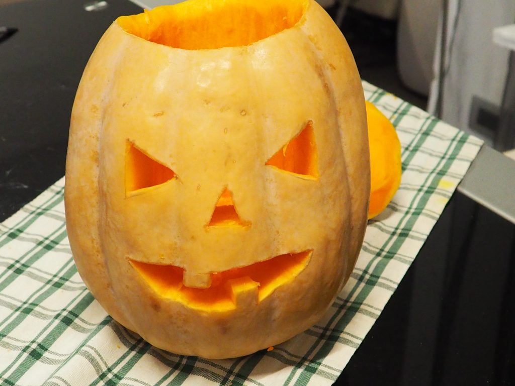 J’ai préparé la citrouille deux jours avant Halloween et je l’ai conservée au réfrigérateur jusqu’au jour de la fête.