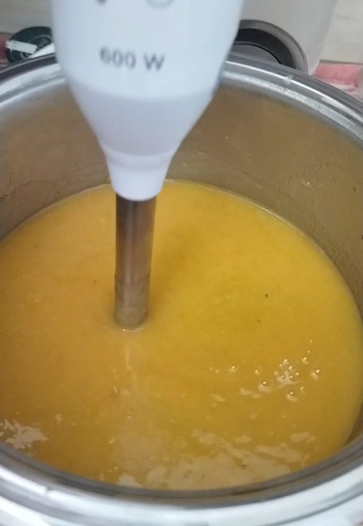 • Avec le mixeur plongeant, réduisez le tout en purée. Cela devrait suffire à hacher la peau des prunes pour qu’elle ne se sente pas sous la dent lorsque vous dégustez votre confiture. Vous pouvez aussi utiliser le moulin à légumes avec le disque à gros trous.