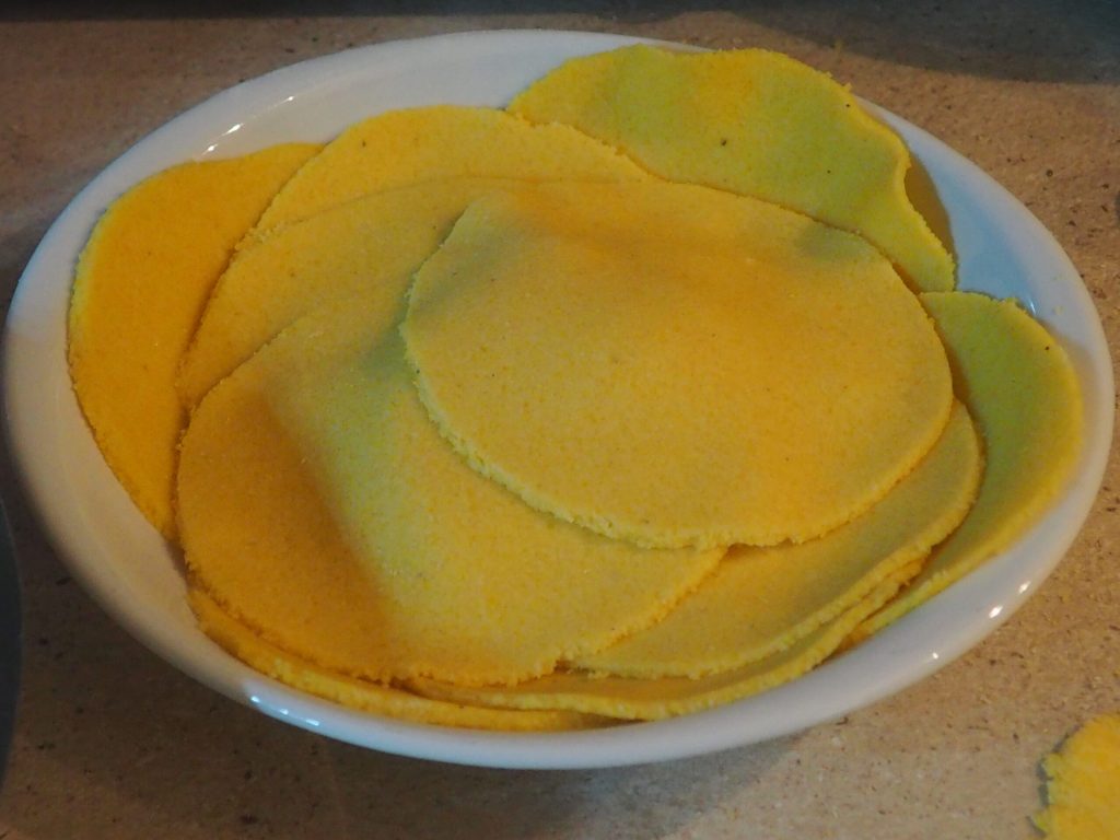 • Procédez ainsi jusqu’à ce que vous ayez fini la pâte, vous obtiendrez environ 13 coquilles pour tacos. Disposez-les sur une surface farinée, couvertes de film plastique.