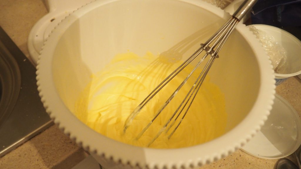 Une fois que le mélange de sucre et d’eau a atteint 121°C, versez-le en filet dans les jaunes et continuez à mélanger jusqu’à ce qu’il devienne tiède.