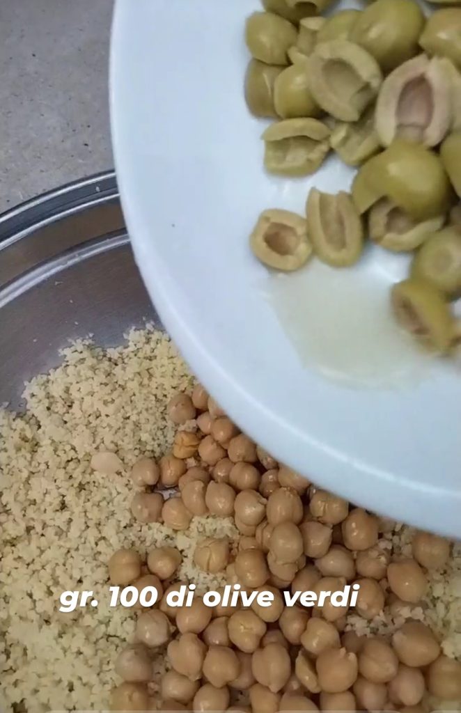 Préparez le couscous selon les instructions sur la boîte. Dans un bol, mettez l’eau tiède et le couscous, couvrez avec le couvercle. Laissez reposer quelques minutes, le couscous aura absorbé l’eau et sera gonflé. Ajoutez maintenant deux ou trois pincées de sel, deux cuillères à soupe d’huile et égrenez-le avec une fourchette. Si vous préférez, vous pouvez aussi l’égrener avec les mains.