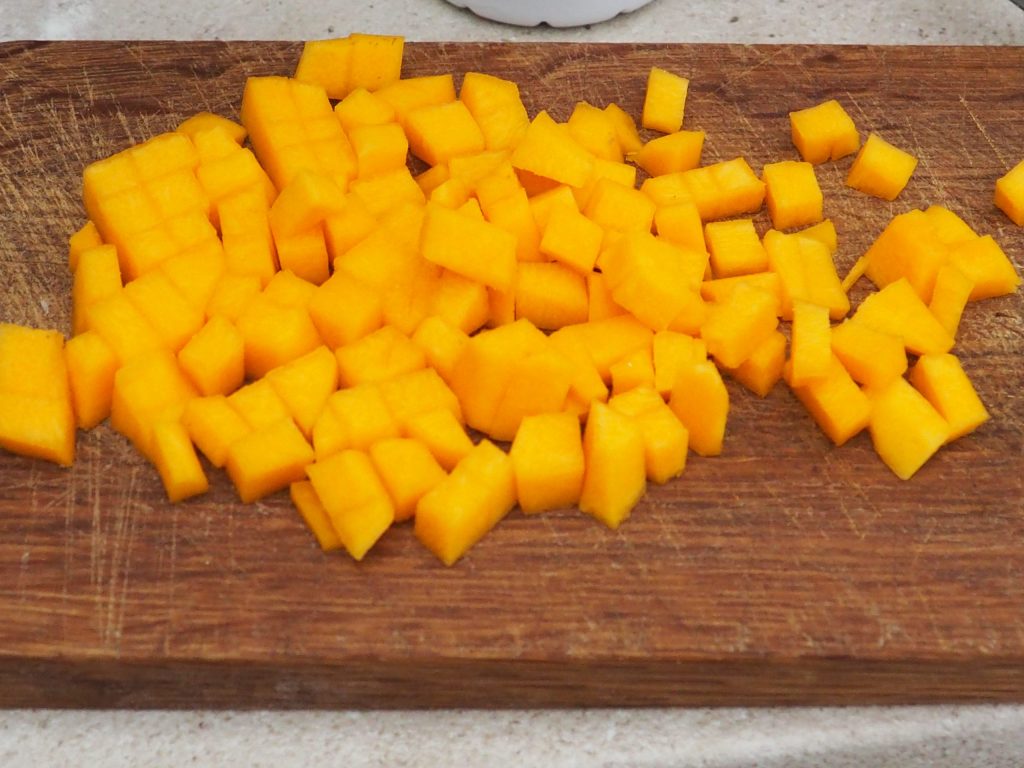 Lavez, retirez la peau et les graines de la citrouille, coupez-la en petits dés.