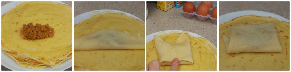 Placez le mélange environ à mi-crêpe, recouvrez avec la partie inférieure de la crêpe sans atteindre le bord supérieur, repliez les extrémités vers l’intérieur, puis roulez vers le haut pour la fermer.
