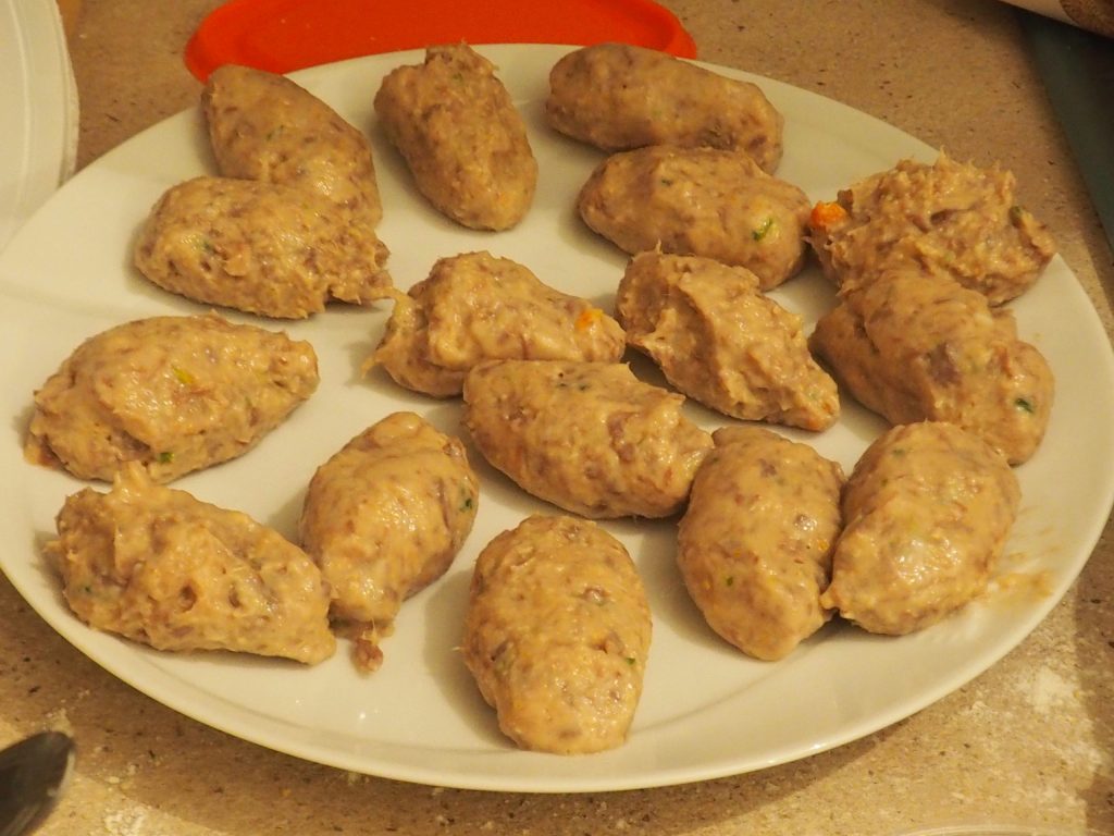 Le mélange restera tout de même assez mou. Humidifiez vos mains avec de l’eau (pour éviter que le mélange colle) et formez des croquettes d’environ 40 g chacune (vous en obtiendrez 23/24).