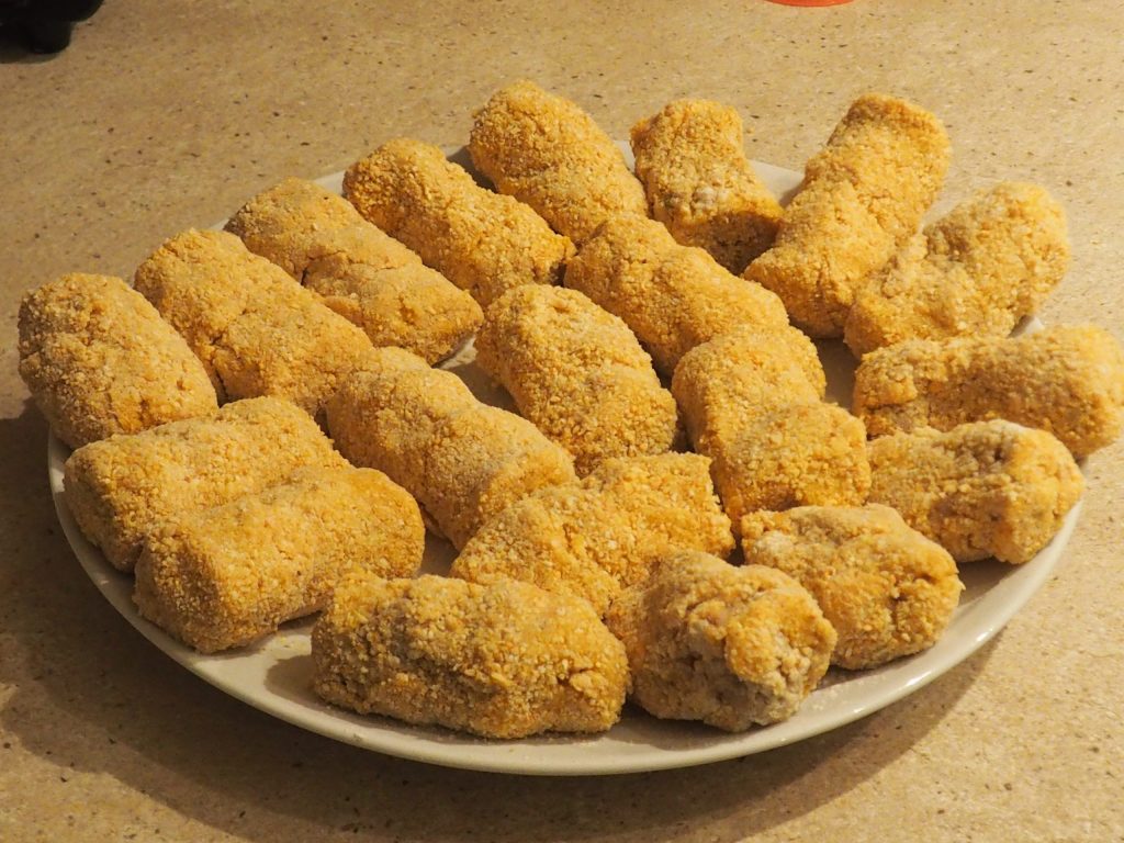 Aidez-vous d’une fourchette pour paner chaque croquette en la passant d’abord dans la farine, puis dans l’œuf et enfin dans la chapelure. Je préfère la double panure, donc passez à nouveau la croquette dans l’œuf et puis dans la chapelure.