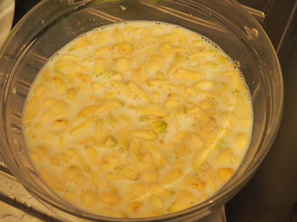 Mettez maintenant l’ail en morceaux dans un bol, recouvrez-le de 500 g de lait et laissez-le tremper pendant une dizaine de minutes.