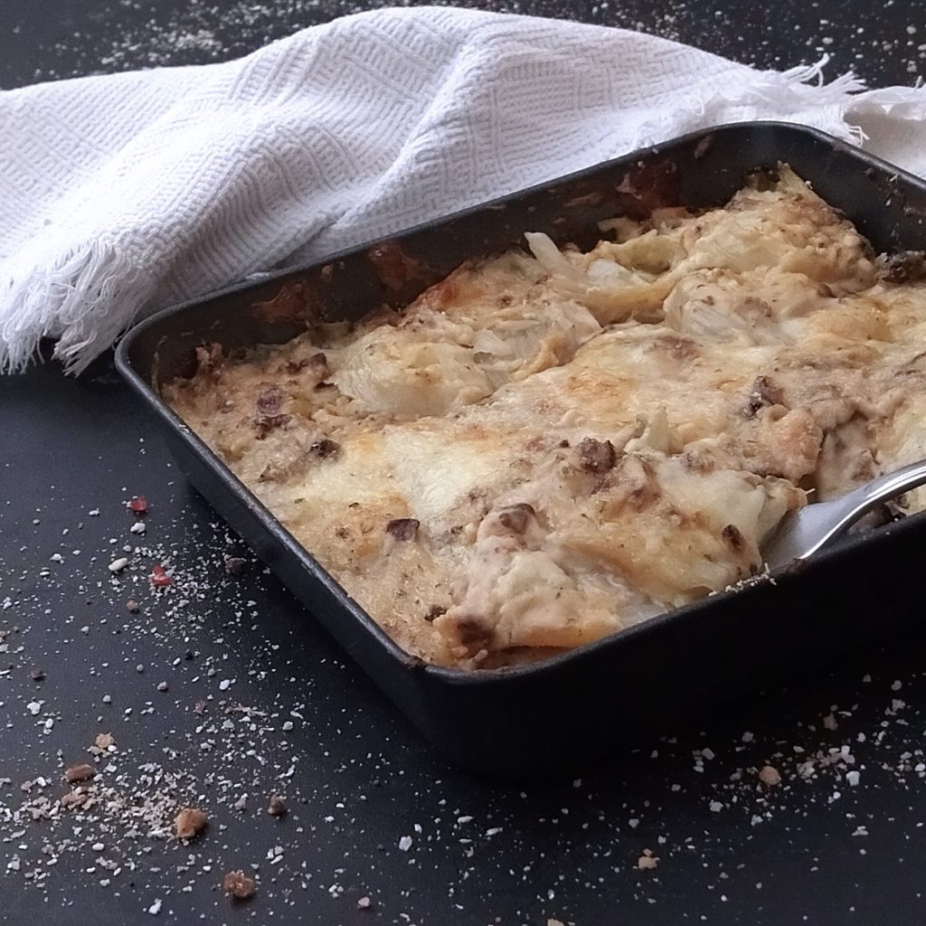 Entre-temps, préparez la béchamel en suivant la procédure que vous trouverez à ce lien (suivez les doses que vous trouvez dans cette recette). Voici les étapes principales : préparez le roux avec du beurre et de la farine, ajoutez le lait tiède, salez, poivrez, mettez de la noix de muscade moulue et mélangez bien avec un fouet. Vous devez obtenir un mélange lisse et fluide.