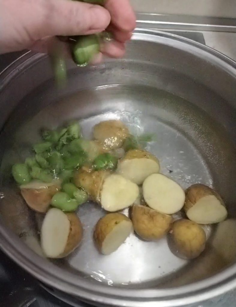 Mettez dans une casserole avec de l’eau les fèves préalablement épluchées (vous en obtiendrez environ 180 g) et les pommes de terre coupées en deux ou en quatre selon la taille. Faites cuire pendant environ 25 minutes, jusqu’à ce qu’elles soient tendres.