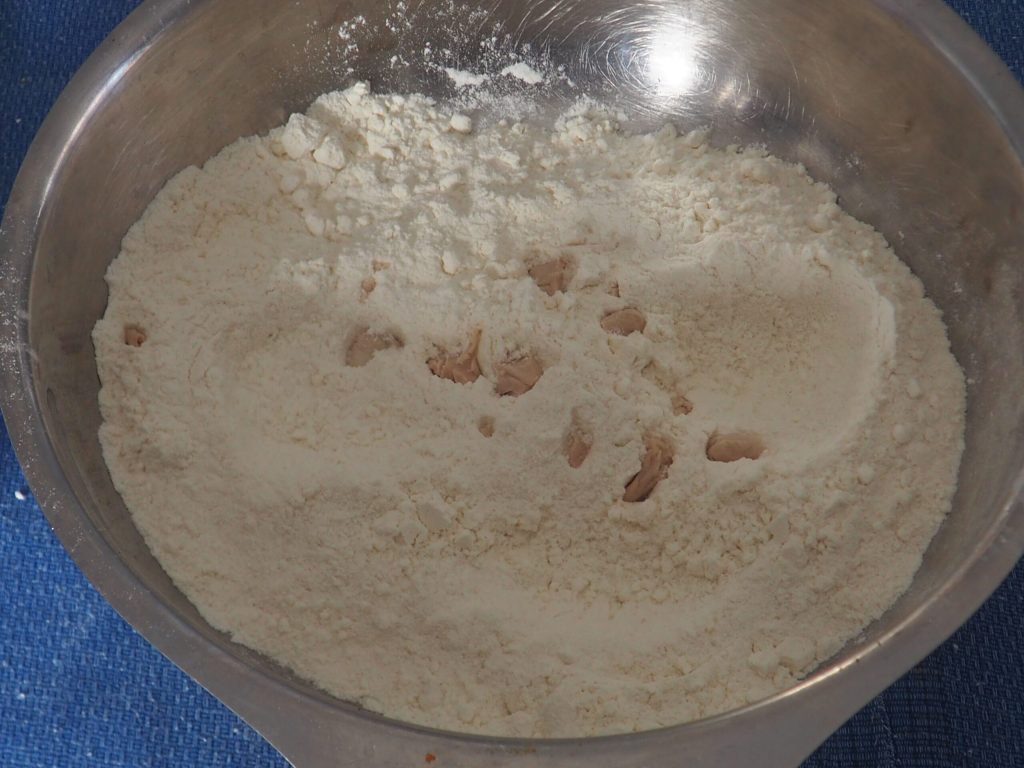 Préparez la pâte en mettant dans un bol la farine 00 et la farine de riz, mélangez-les avec une cuillère et ajoutez la levure de bière en petits morceaux.