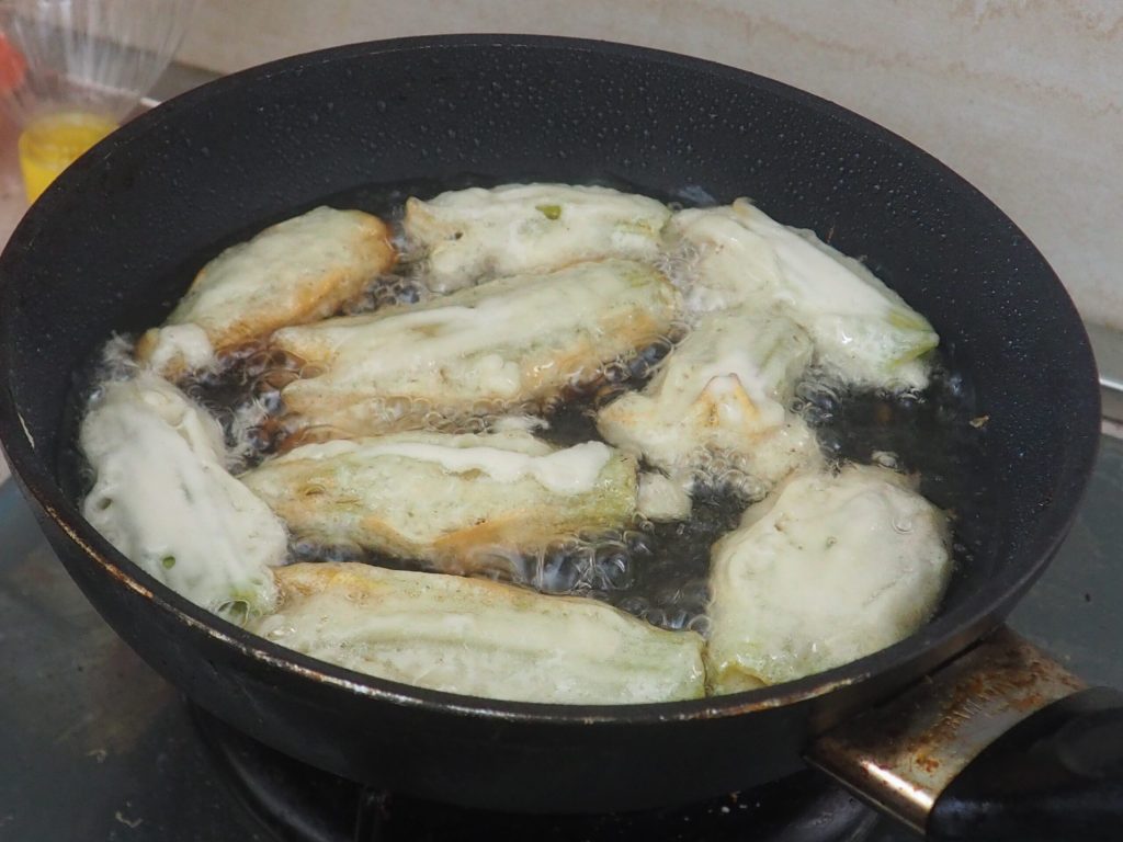 Versez l’huile dans une poêle, faites-la bien chauffer. Passez les fleurs de courgette dans la pâte puis plongez-les dans l’huile.