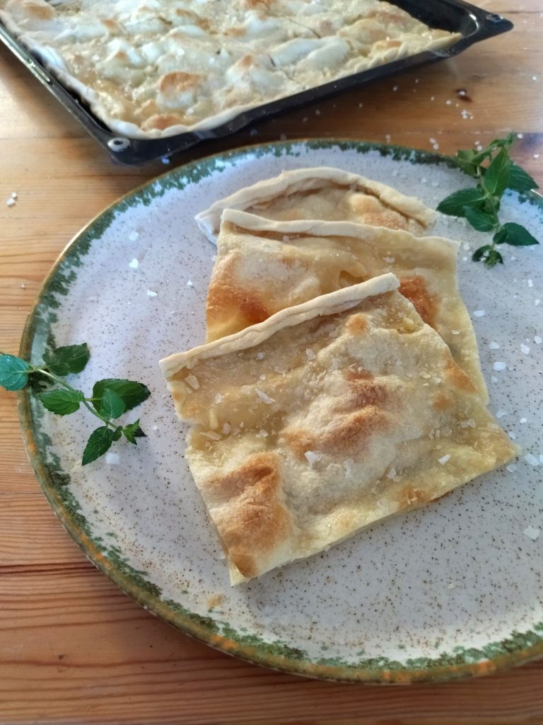 Recouvrez avec l’autre pâte, humidifiez un peu les bords de la pâte avec de l’eau, assurez-vous que la pâte supérieure adhère bien à la pâte inférieure et refermez-les en les enroulant sur eux-mêmes. Faites des trous équidistants dans la pâte supérieure pour qu’elle ne gonfle pas pendant la cuisson, saupoudrez la surface d’huile d’olive, répartissez-la aussi sur le bord, ajoutez du gros sel.