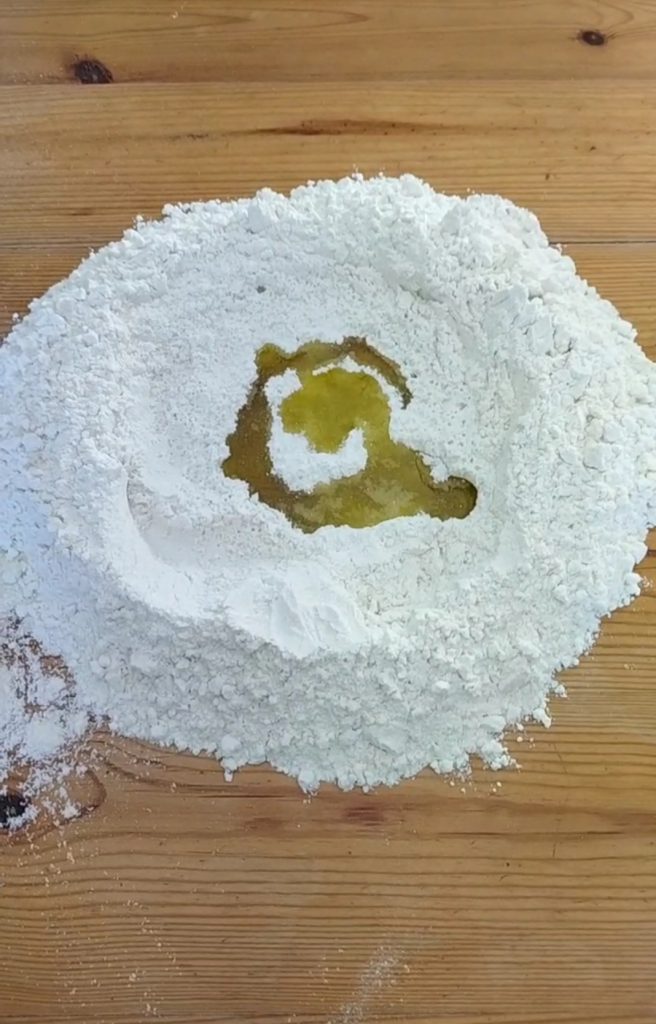 Versez la farine en fontaine sur un plan de travail, ajoutez l’huile, le sel et l’eau petit à petit.