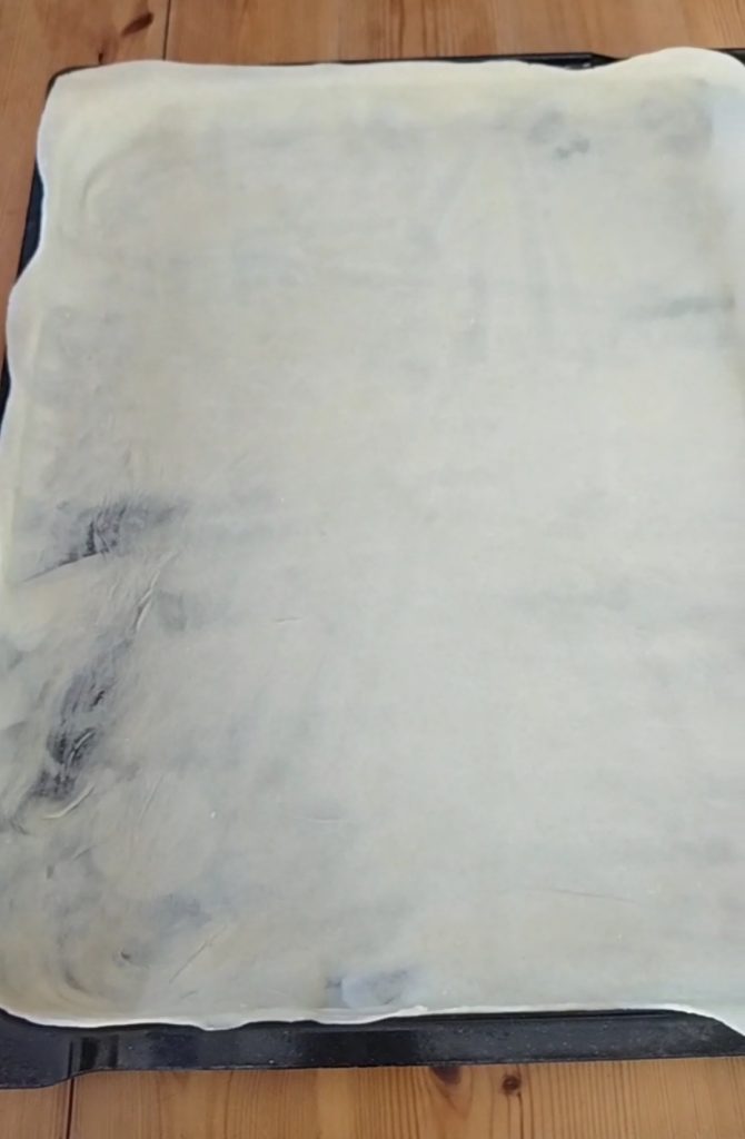 Avec un rouleau à pâtisserie, étalez la première partie, elle doit être très fine, environ un millimètre d’épaisseur. Je vous conseille d’utiliser vos mains pour étirer doucement la pâte et l’élargir. Faites de même avec la deuxième partie de la pâte. Beurrez la plaque du four, de dimensions 33×40 cm, étalez la pâte et recouvrez également les bords.