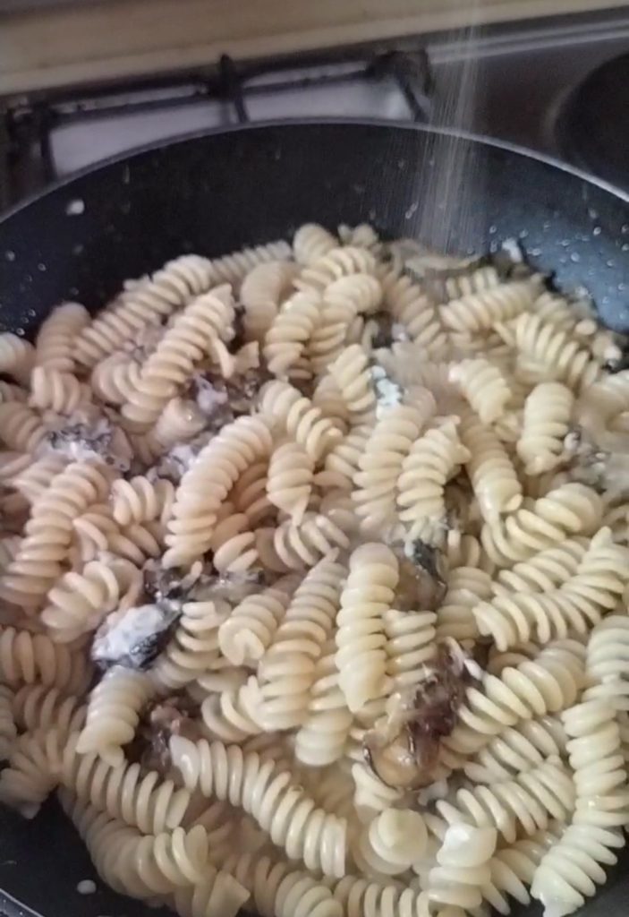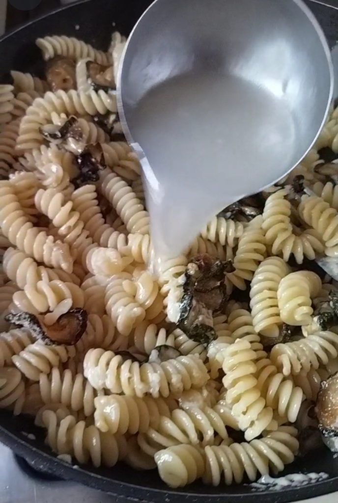 Ajoutez un peu d’eau de cuisson des pâtes et faites sauter le tout pour terminer la cuisson.