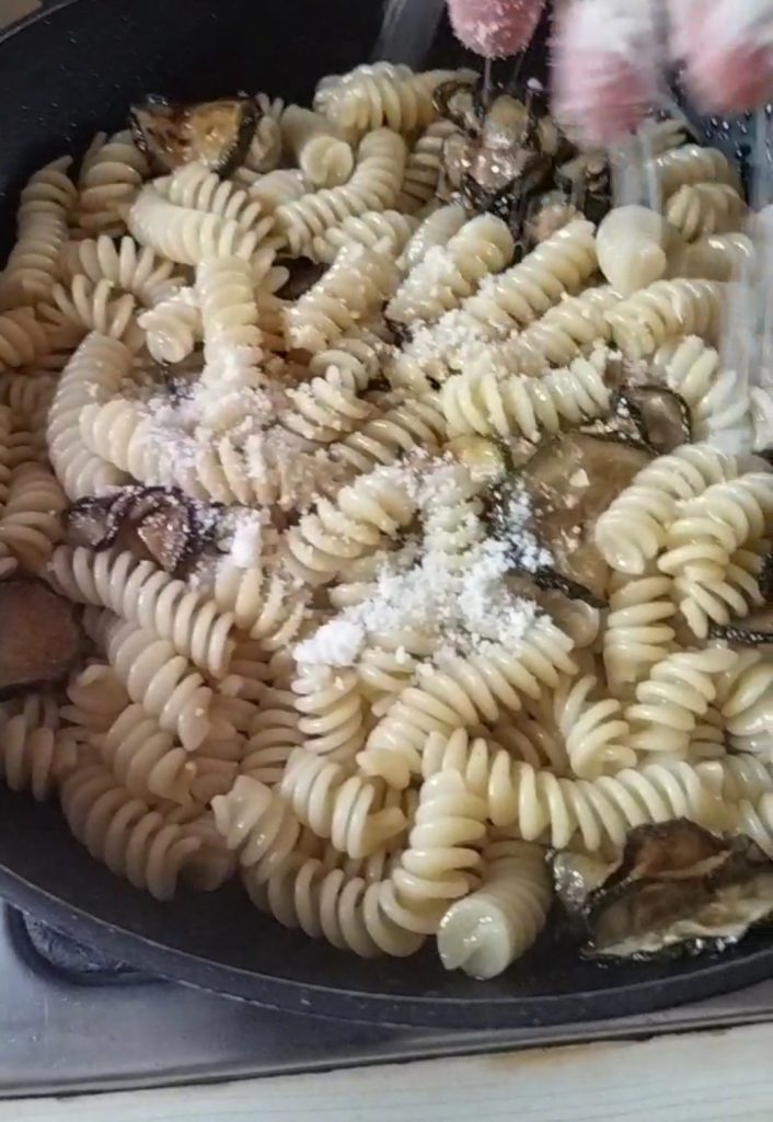 Éteignez le feu, ajoutez le parmesan et mélangez jusqu’à absorption complète. Si les pâtes sont sèches, ajoutez encore un peu d’eau de cuisson.