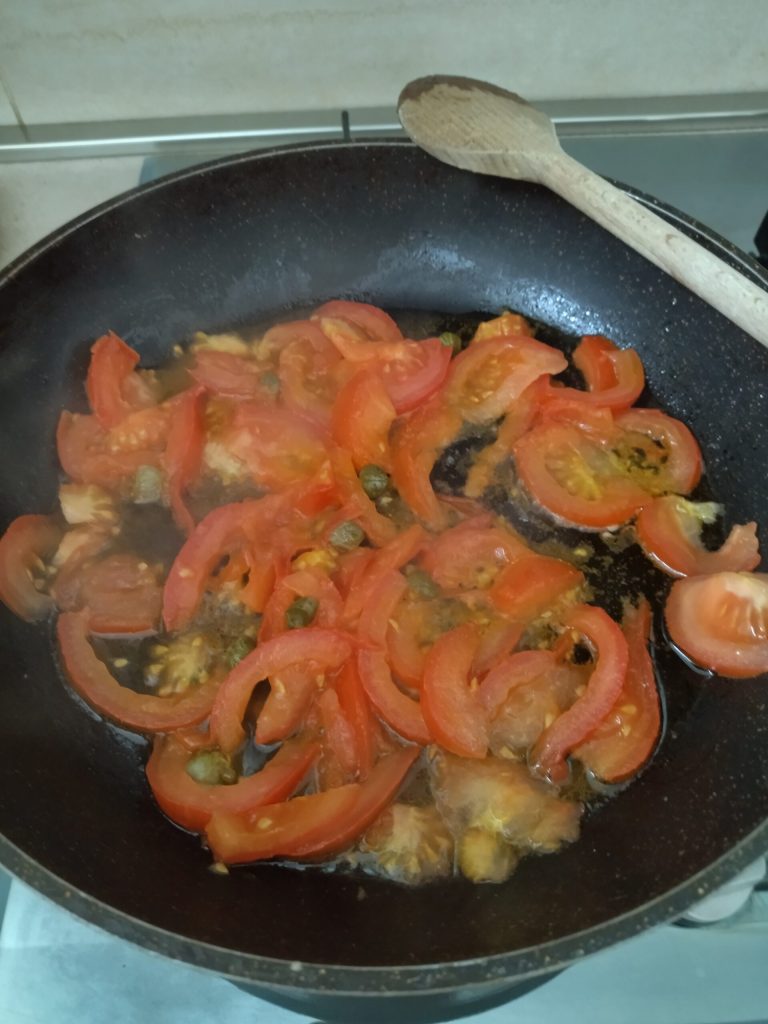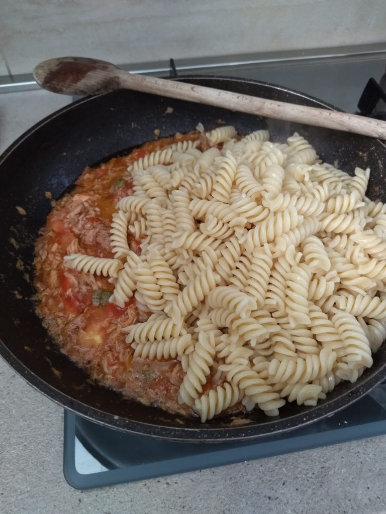 À ce stade, ajoutez le thon (si vous le souhaitez, vous pouvez le égoutter de son huile de conservation ou l’utiliser, à votre guise), les câpres, mélangez bien et laissez cuire encore quelques minutes. Ajustez le sel si nécessaire.