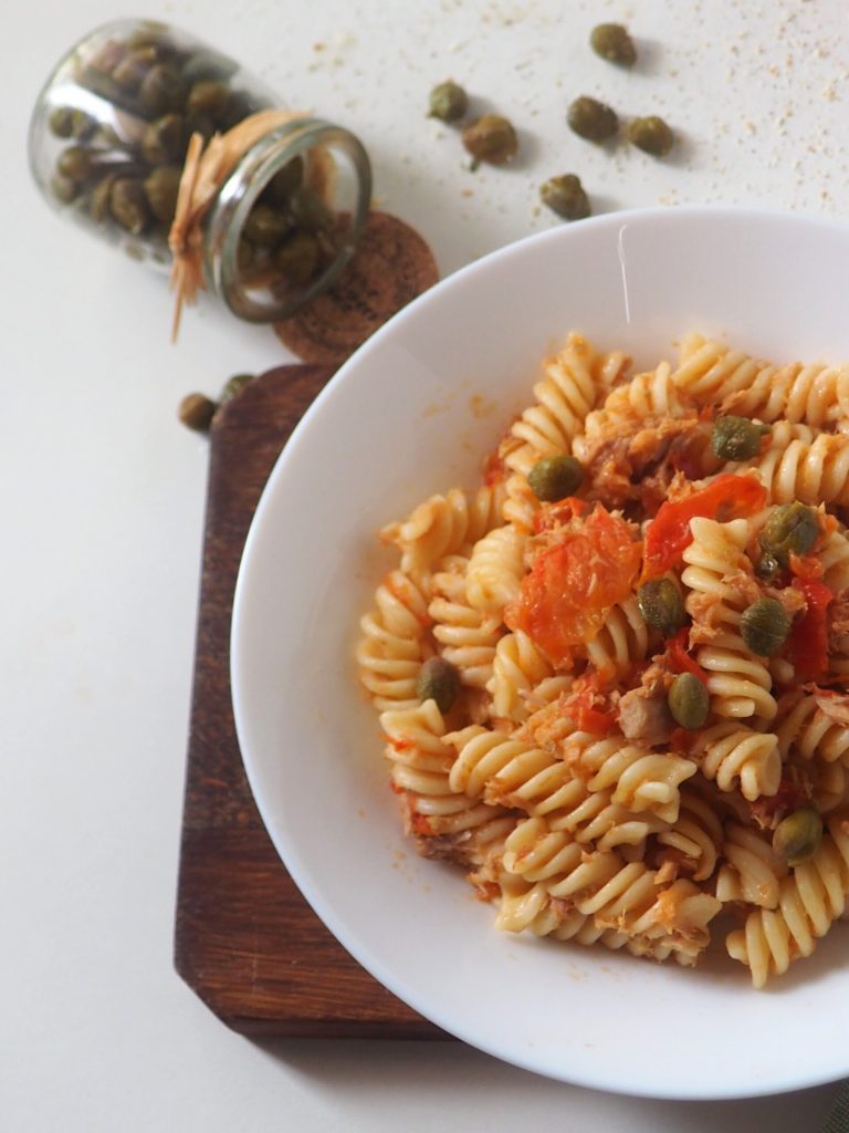 Voici les Fusilli avec tomates, thon et câpres, un autre plat principal très simple à préparer, mais avec un goût vraiment super. Idéal lorsque vous avez peu de temps, mais que vous voulez quand même impressionner avec un plat savoureux. Si vous aimez, vous pouvez également ajouter des olives noires.