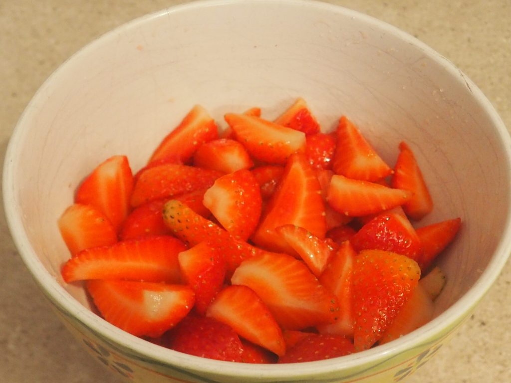 Lavez, nettoyez et coupez les fraises en quatre. Mettez-les dans un bol avec le jus de citron, le sucre, mélangez et laissez reposer au frigo pendant environ une demi-heure.