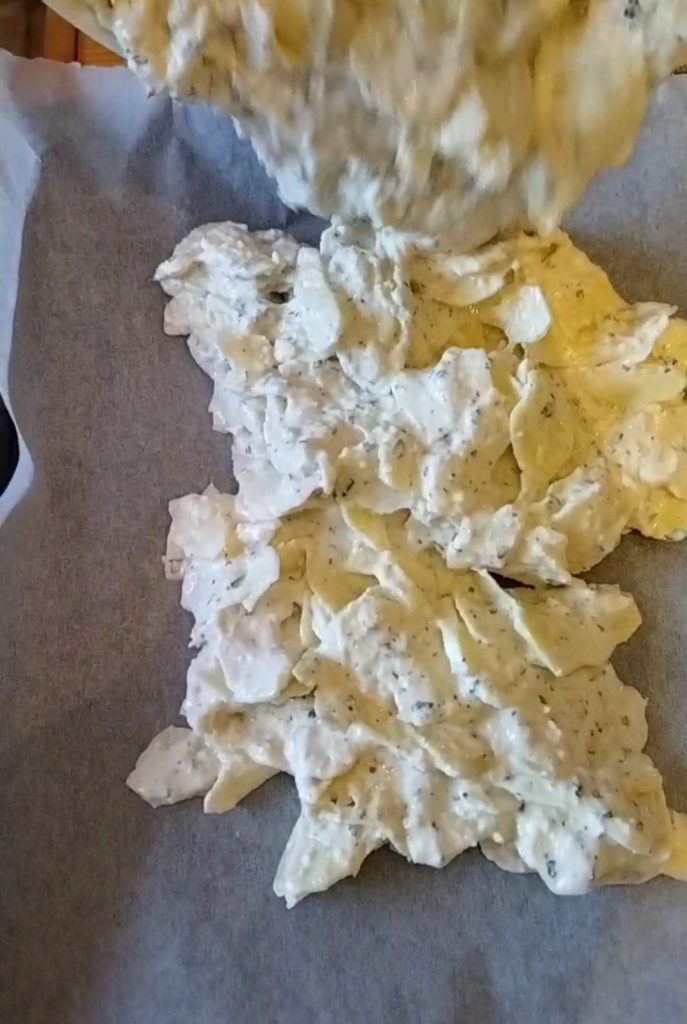 Couvrez une plaque du four (la mienne mesure 37×33 cm) avec du papier sulfurisé et versez-y le mélange de pommes de terre. Essayez de le niveler au mieux.