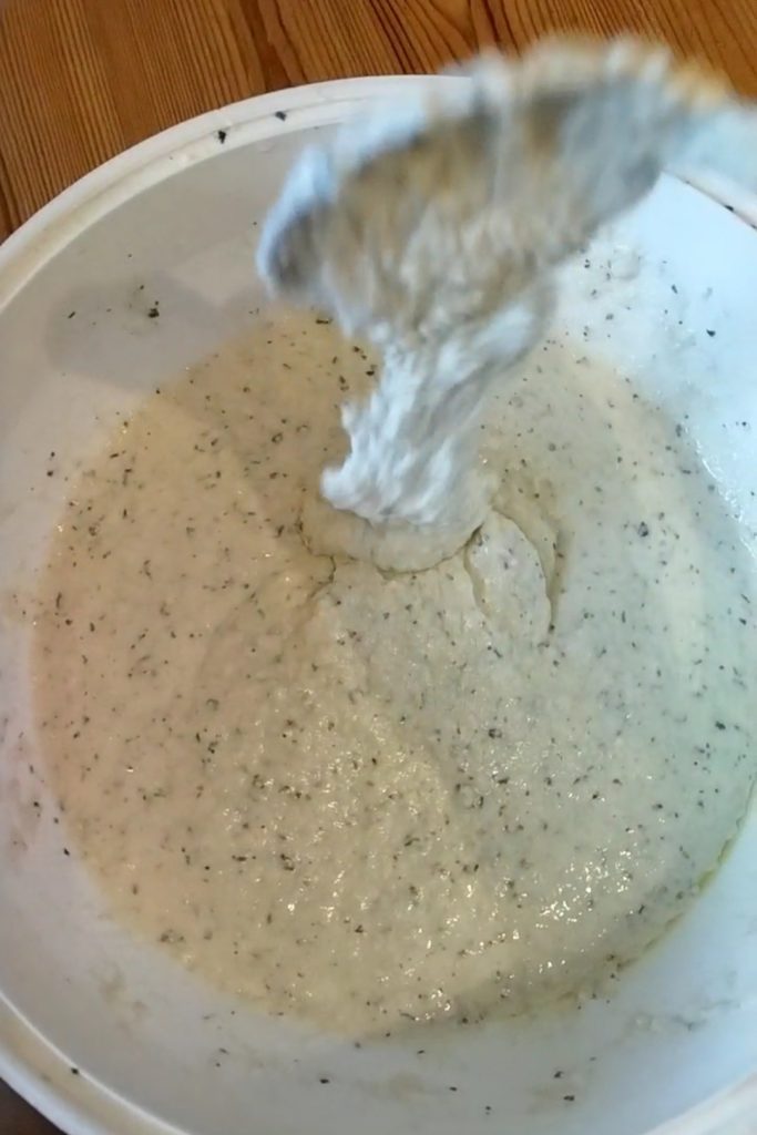 Dans un bol, mettez la farine, le parmesan, le sel, l’eau, l’origan et mélangez avec une cuillère. La pâte ne doit être ni trop dense, ni trop liquide.