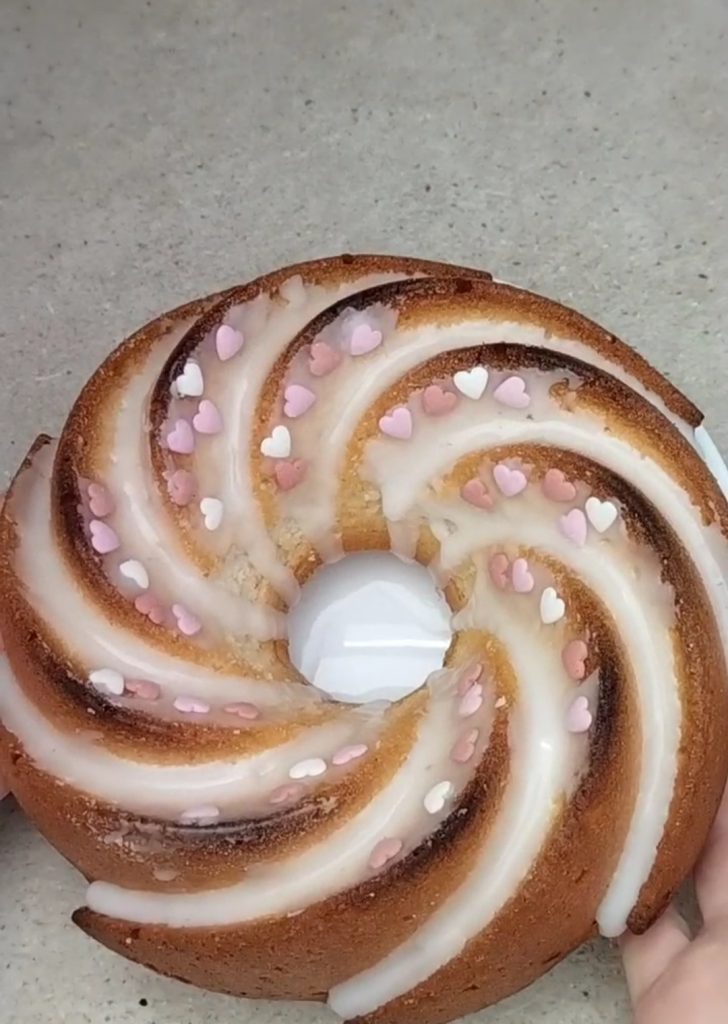 Le Gâteau à la couronne aux blancs d’œufs est un dessert vraiment surprenant ! Je l’ai aromatisé avec du jus de citron et de l’arôme de citron pour le rendre encore plus gourmand, vous pouvez aussi choisir le jus d’orange si vous préférez. De plus, c’est très utile si vous avez des blancs d’œufs en excès. Pour la Saint-Valentin, je l’ai décoré avec plein de petits cœurs et un glaçage à l’eau, pour le rendre encore plus joli.
