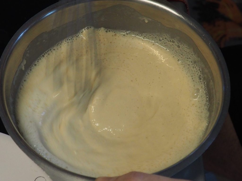 Dans un saladier, mettez les jaunes avec le sucre et battez bien avec un fouet jusqu’à ce qu’ils soient montés.