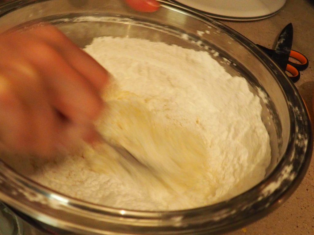 Avec une fourchette commencez à incorporer le sucre glace avec le liquide.