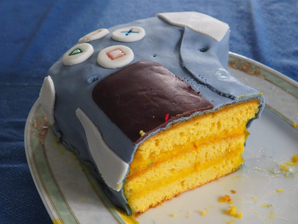 Dessinez sur un morceau de papier la forme de la Console PS4, placez-la sur le gâteau et découpez les contours.