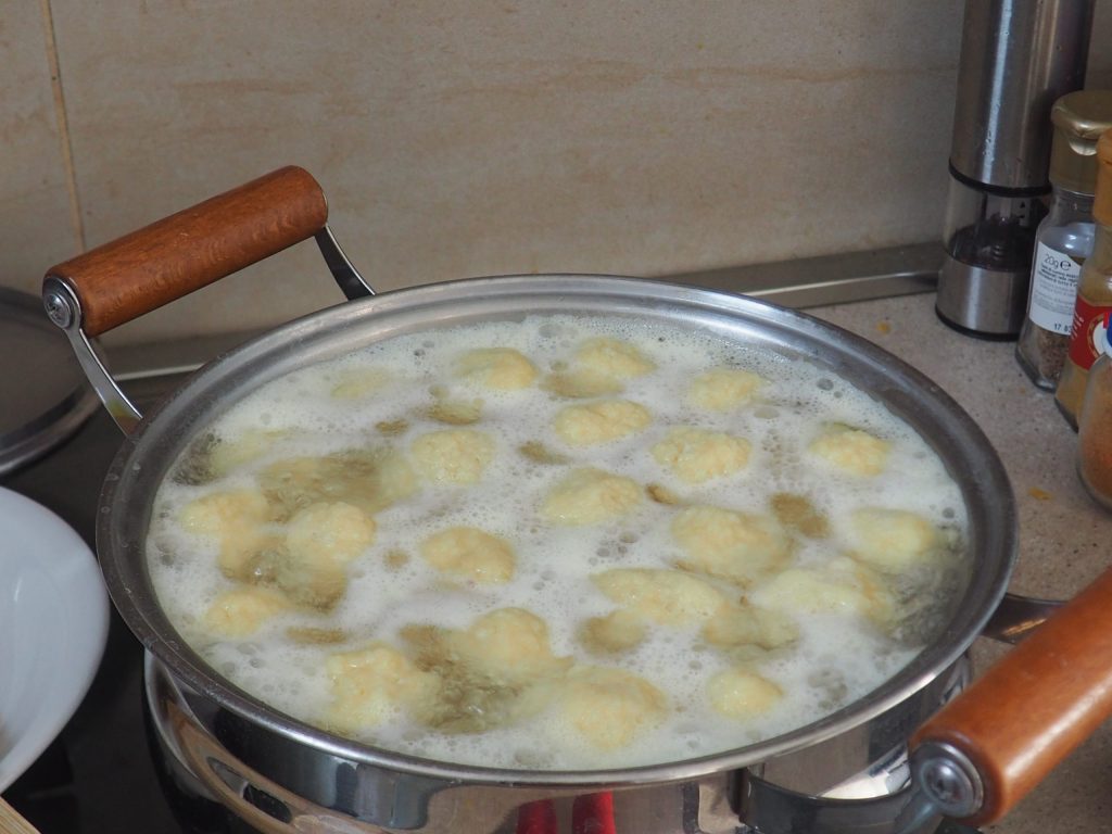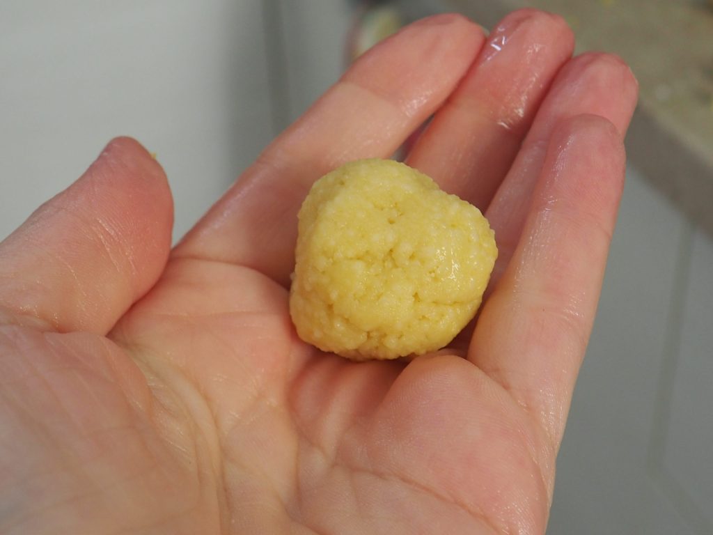 Avec le pouce, faites une cavité dans la boule et remplissez-la avec un peu de fromage et un ou deux cubes de lard. Refermez le gnocchi, aplatissez-le légèrement avec les mains humidifiées pour le fermer parfaitement. Ensuite, roulez-le entre les paumes des mains, toujours humidifiées. Essayez de l’aplatir pour mieux compacter le tout.