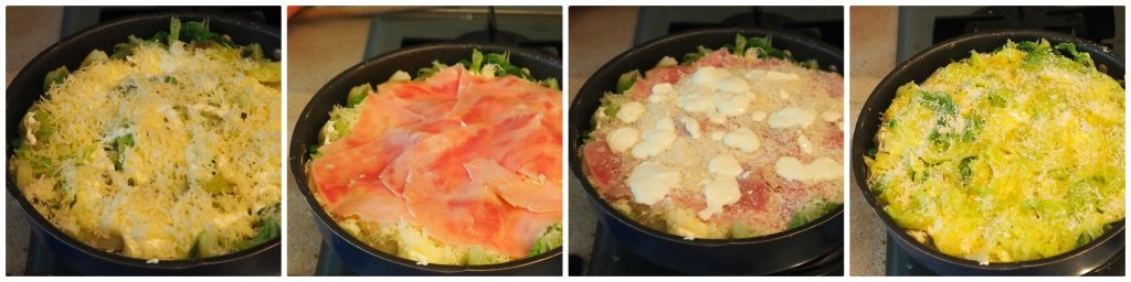 Faites une autre couche avec le reste du provolone râpé, puis les tranches de jambon restantes, le parmesan (laissez-en une poignée pour saupoudrer la surface du gratin), la crème restante, recouvrez en utilisant toutes les feuilles de chou.