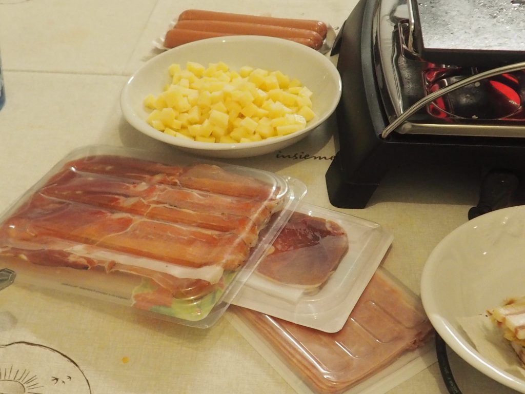 Pour profiter au mieux de la Raclette, je vous conseille de choisir les ingrédients qui vous plaisent le plus. Nous utilisons habituellement du jambon cru, du jambon cuit, du speck, des saucisses, du lard, des pommes de terre bouillies, des saucisses, des petits oignons, mais vous pouvez vous amuser avec ce que vous préférez, peut-être en ajoutant des légumes comme des courgettes ou des poivrons.