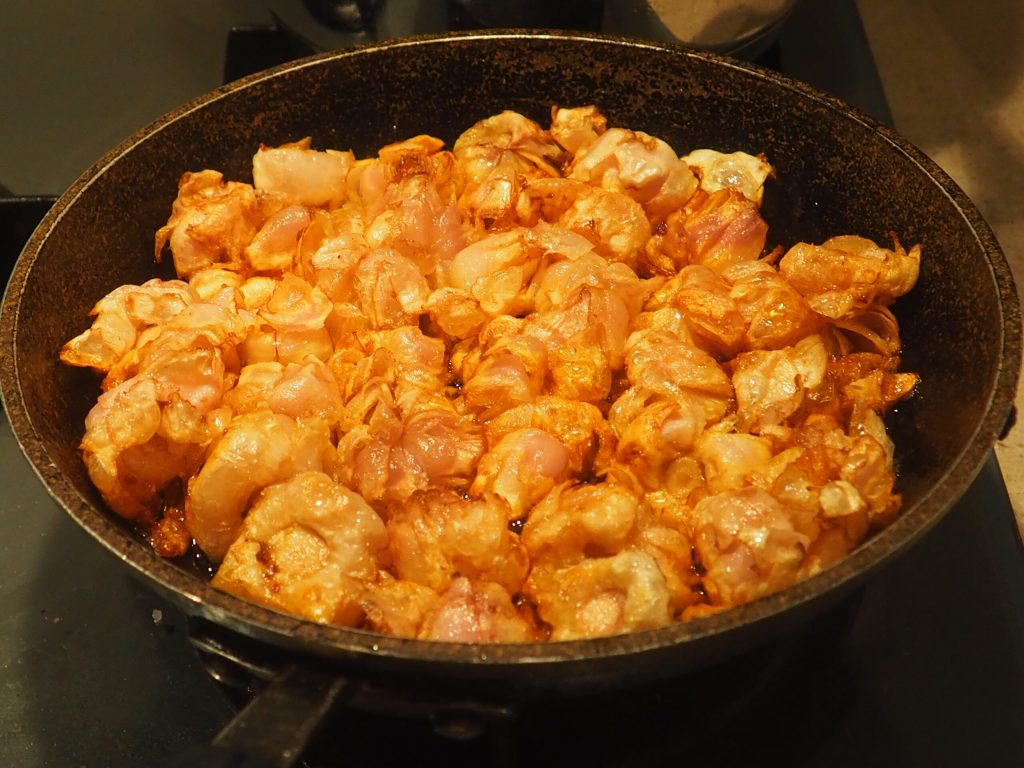 Dans une poêle avec suffisamment d’huile bouillante, mettez les lampascioni un peu à la fois, tournez-les souvent, ils cuiront en s’ouvrant comme une rose et seront croustillants à l’extérieur.