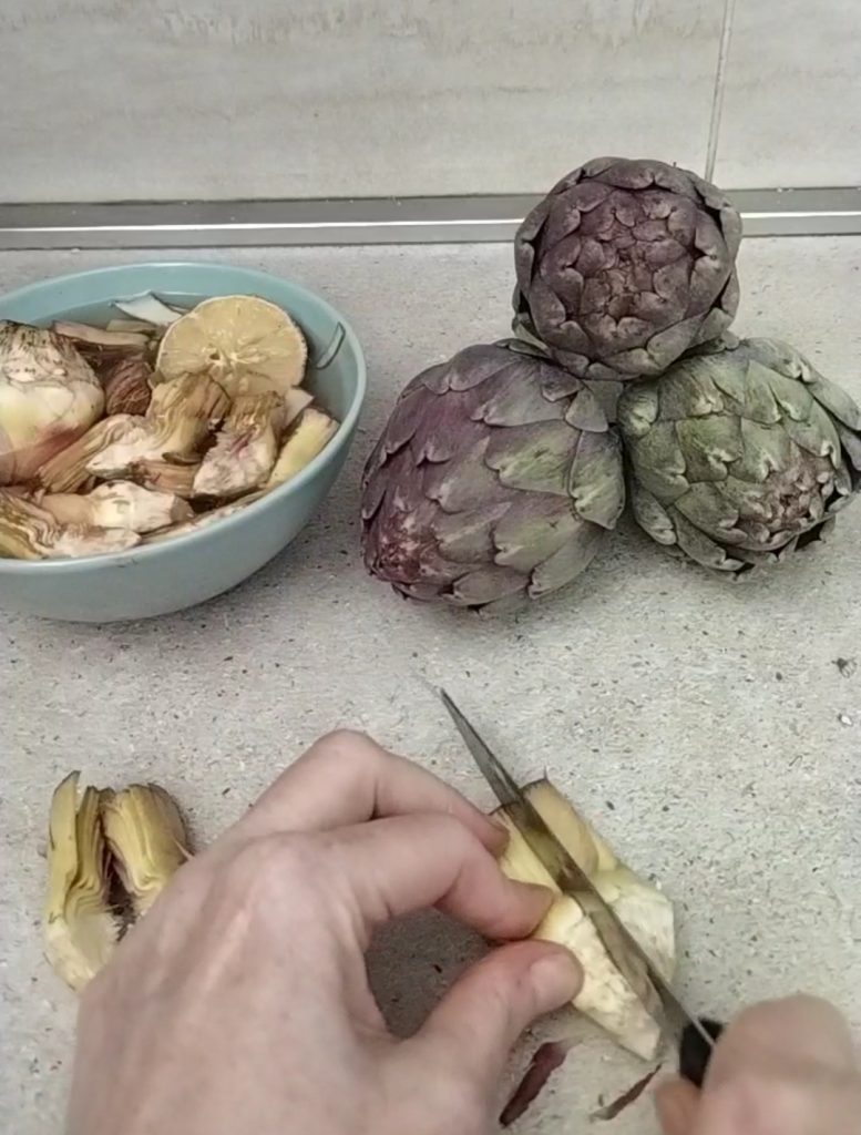 • Coupez chaque artichaut en 8 parties, mettez-les dans un saladier avec de l’eau et du citron pour éviter qu’ils ne noircissent.