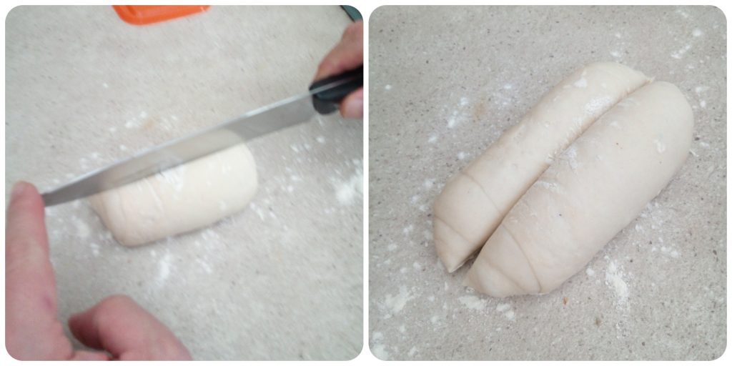 • Laissez lever comme ceci pendant environ 3 heures. Puis prenez le pâton, placez-le sur la plaque du four recouverte de papier sulfurisé et avec le dos d’un long couteau (ou l’outil approprié pour travailler le pain) coupez-le en deux dans le sens de la longueur. Retournez le pâton à l’envers, de sorte que la partie avec la coupe soit maintenant vers le haut.