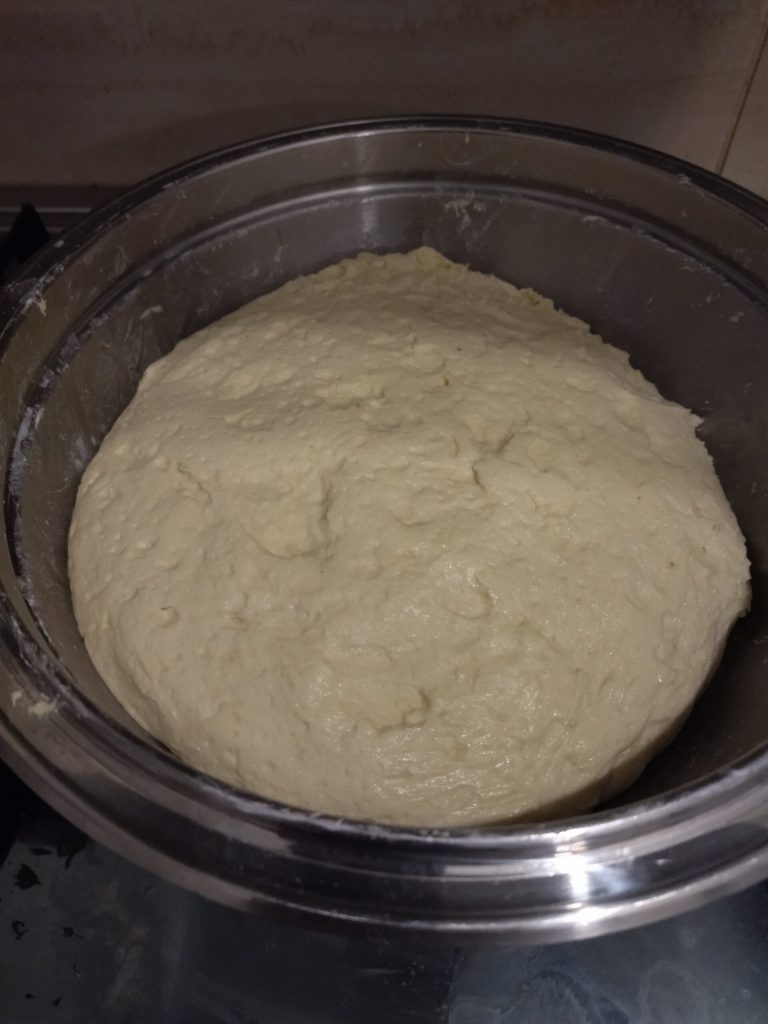Mettez la farine dans un bol, ajoutez la levure activée, l’eau, pétrissez et ajoutez le sel. Si la pâte est trop compacte, humidifiez-vous souvent les mains et pétrissez jusqu’à obtenir une pâte lisse, molle et légèrement collante. Farinez le fond du bol et la surface de la pâte, couvrez avec un film plastique, un torchon, une couverture et laissez lever pendant une ou deux heures.