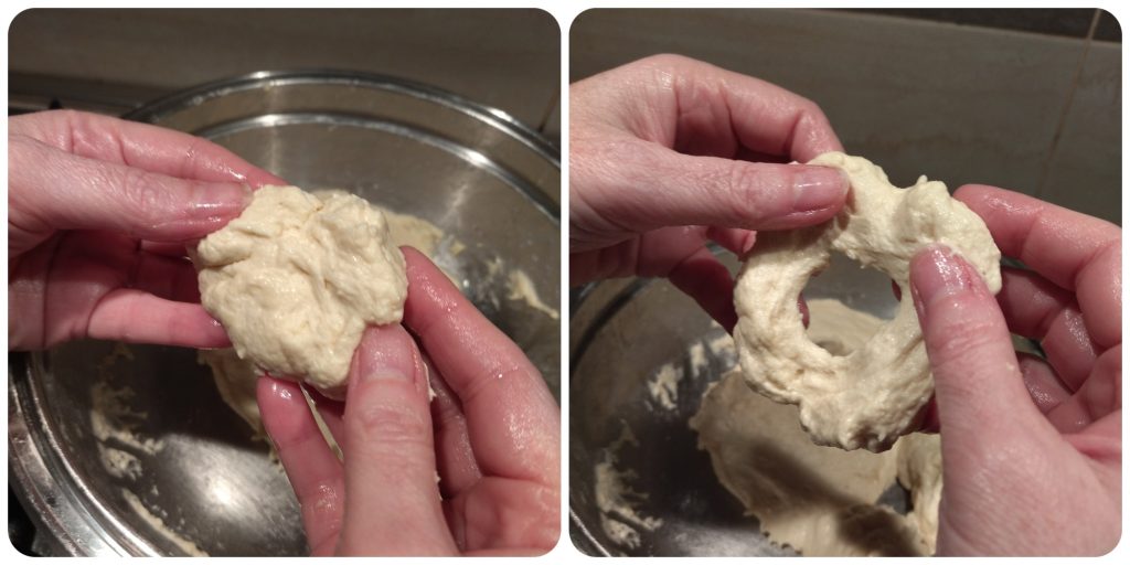 Humidifiez vos doigts avec l’huile de graines, sinon la pâte collera aux doigts. Prenez des boules d’environ 50 g, faites un trou au centre. Vous en aurez environ une vingtaine.