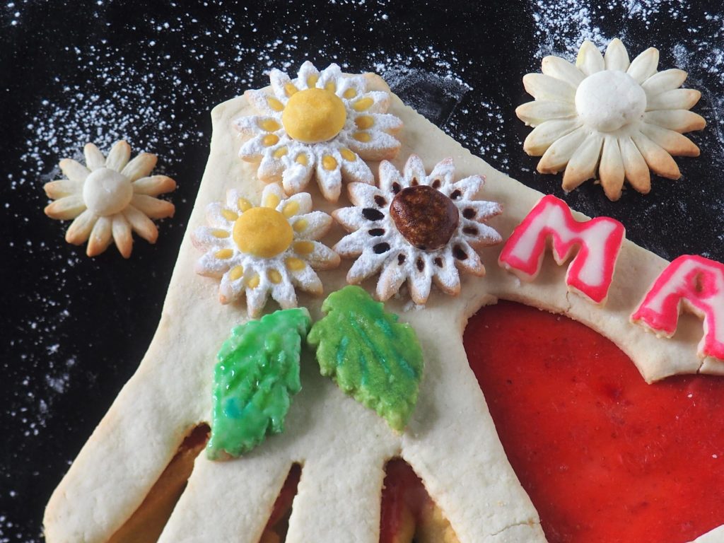 Découpez également les décorations, fleurs, feuilles, l’inscription maman, vous pouvez laisser libre cours à votre imagination. Faites cuire à 170° pendant environ 10/12 minutes. Vérifiez toujours pendant la cuisson. Ce sera le couvercle de votre tarte.