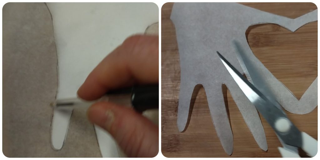 Prenez une feuille de papier sulfurisé, posez dessus la forme des mains découpée dans le papier, dessinez le contour des mains sur le papier sulfurisé et découpez-le avec des ciseaux.
