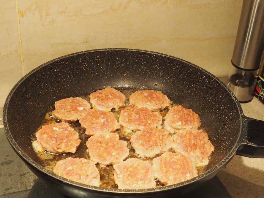 Pour obtenir des mini hamburgers tous identiques, j’ai utilisé un emporte-pièce, mais vous pouvez également les préparer à la main en pressant la viande pour la compacter. Vous obtiendrez une vingtaine de petits disques d’environ 1 cm de hauteur pesant environ 30 g.