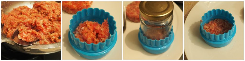 Si vous souhaitez utiliser l’emporte-pièce : prenez une cuillère à soupe rase de pâte (environ 30 g par mini hamburger), placez-la dans l’emporte-pièce de 6 cm de diamètre, appuyez avec un petit récipient en le tournant lors du retrait pour éviter que la viande ne colle. Retirez l’emporte-pièce et placez les hamburgers sur une assiette.
