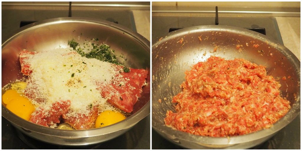 Dans un bol, mélangez la chair à saucisse, les oeufs, le parmesan, le persil, le sel, le poivre et la gousse d’ail, ainsi que la chapelure.