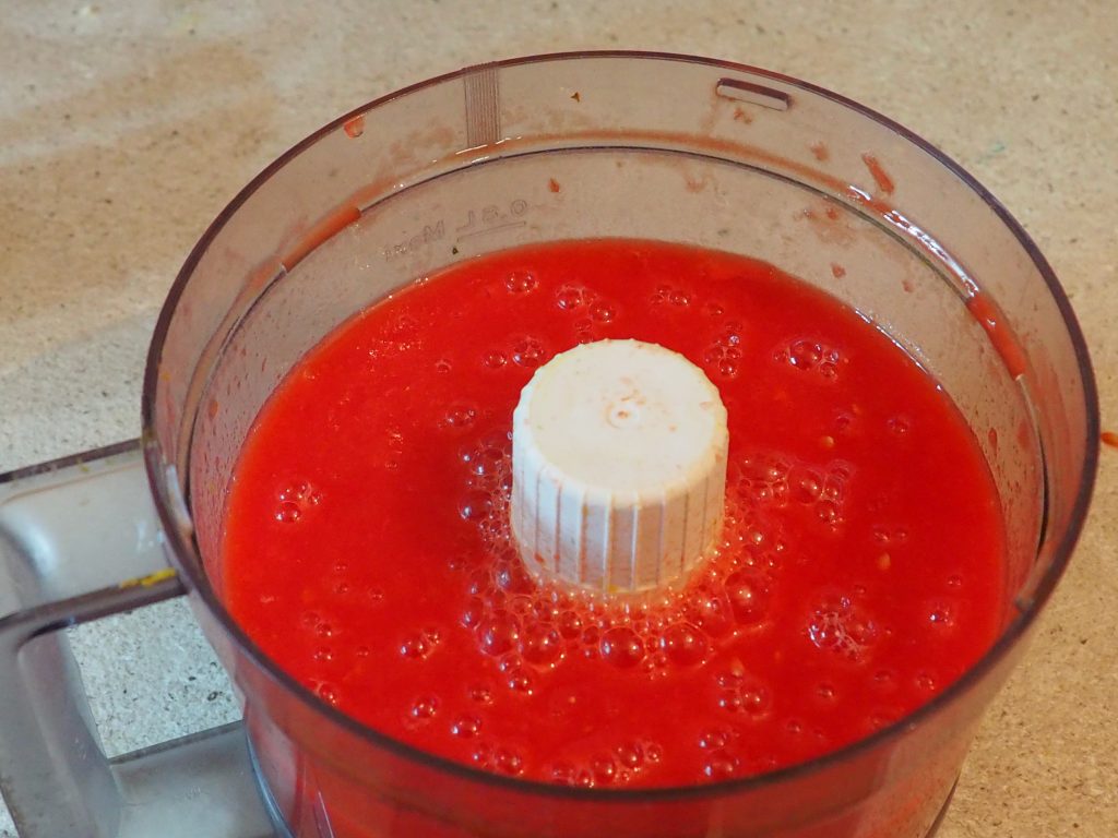 Nettoyez les tomates, enlevez la peau et les graines, mixez-les jusqu’à obtenir une sauce sans morceaux.