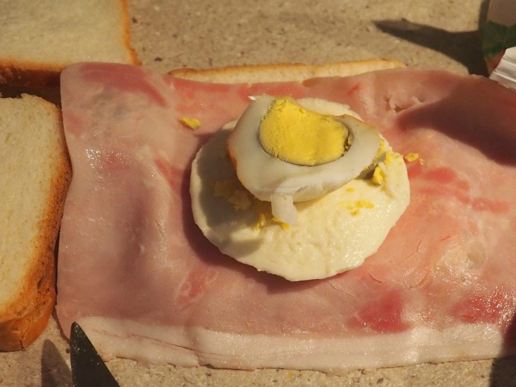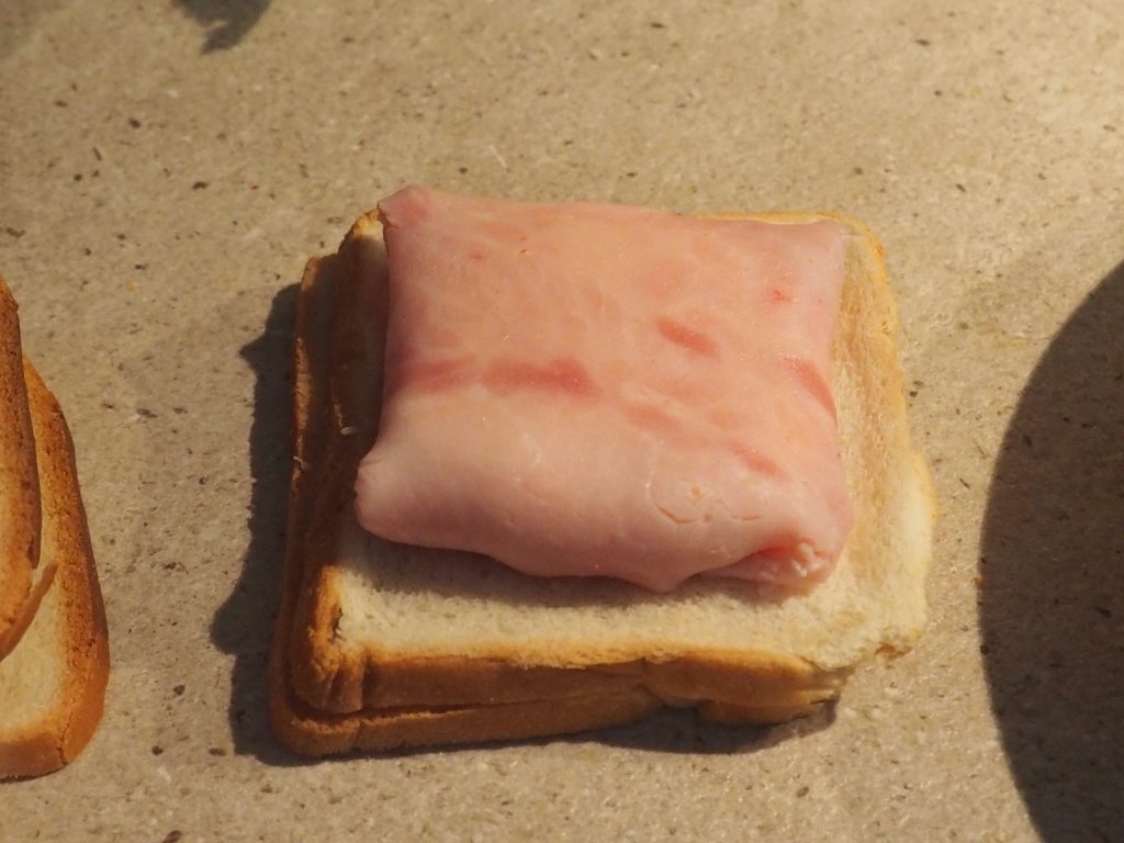 Prenez une tranche de pain de mie (si vous le souhaitez, vous pouvez couper les bords avec un couteau), placez dessus la tranche de jambon, puis encore la tranche de mozzarella et enfin une tranche d’œuf dur.